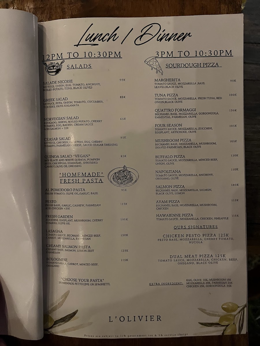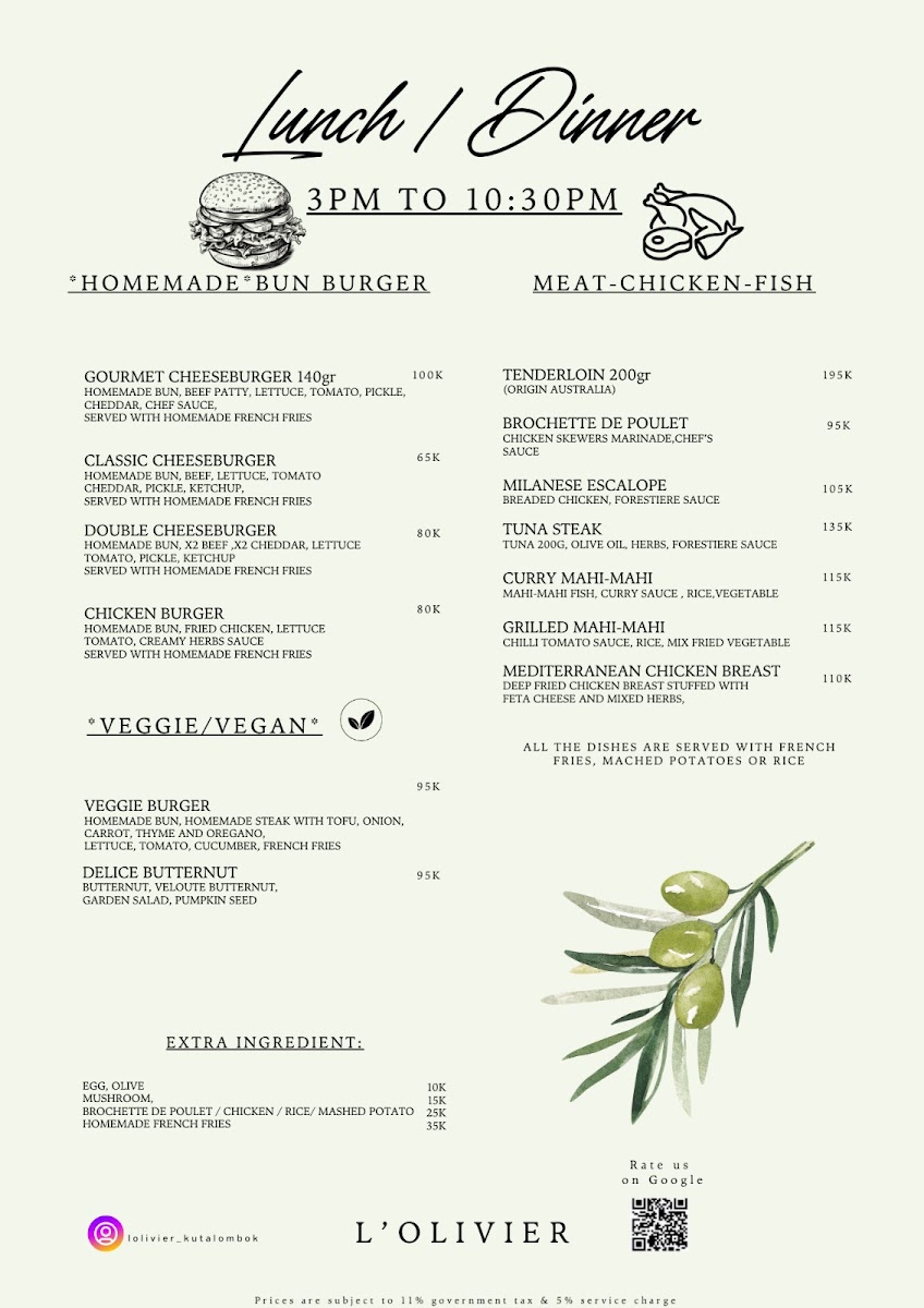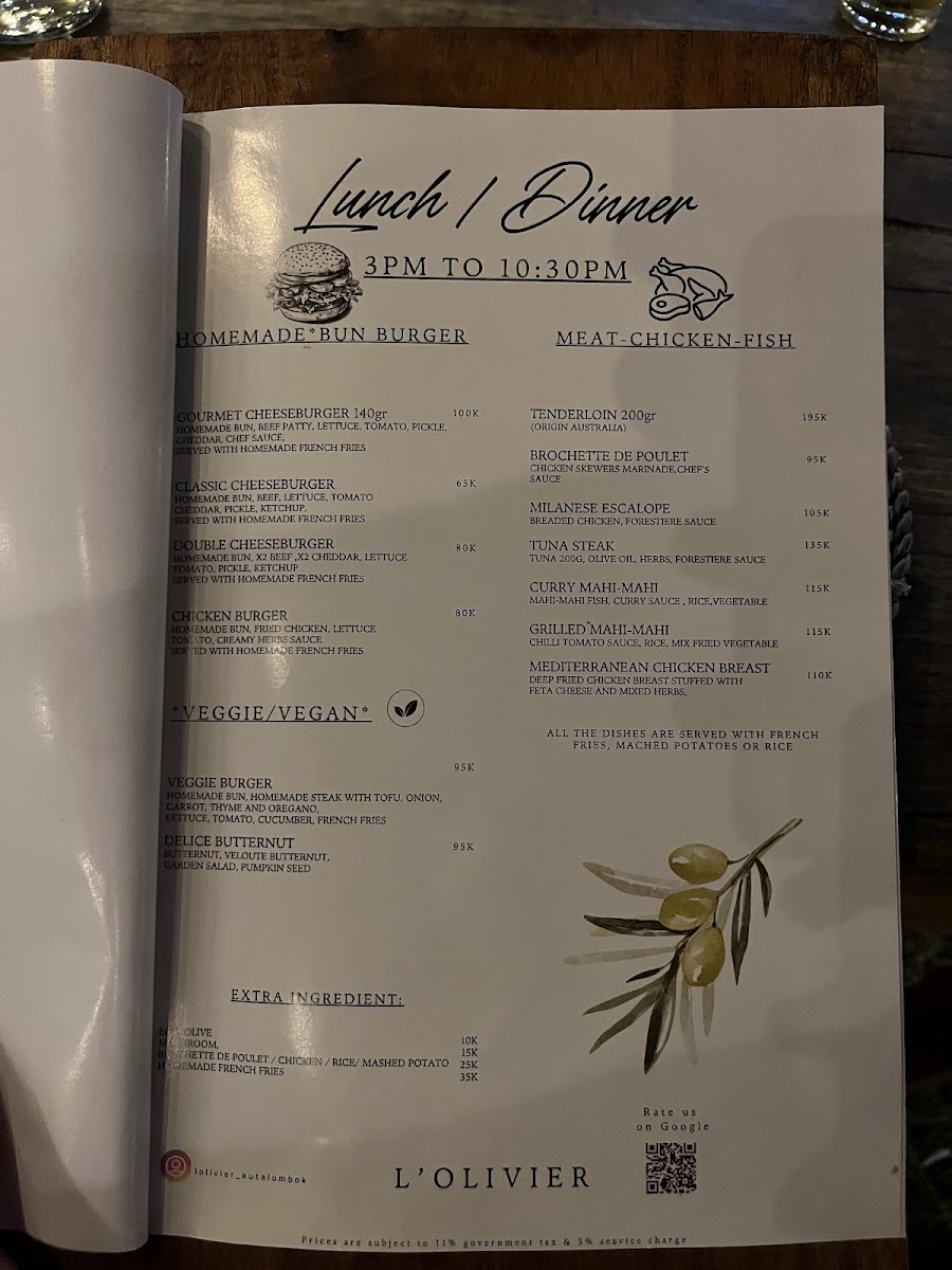 Welcome to L'Olivier restaurant, a hidden gem located in the heart of Kuta, Lombok. This culinary haven offers a varied menu that transports you beyond traditional Indonesian flavors. Patrons rave about their dishes, with standout items like fresh pizzas, delicious wraps, and delightful avocado toasts. The homemade pasta and generous burgers also draw praise, showcasing the kitchen's commitment to quality. Guests like Lusi Folk and Samra B found joy in the vibrant food options that cater to diverse palates, despite the recognition that it's not a typical local dining experience.