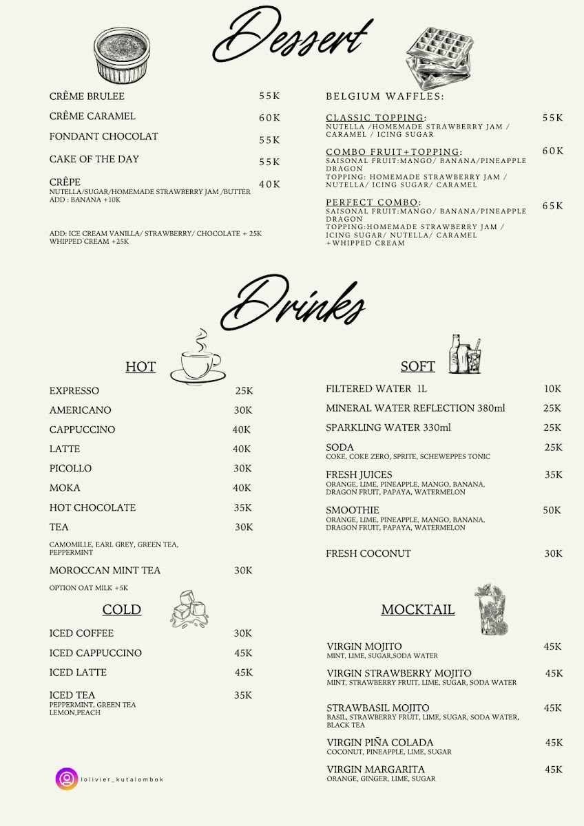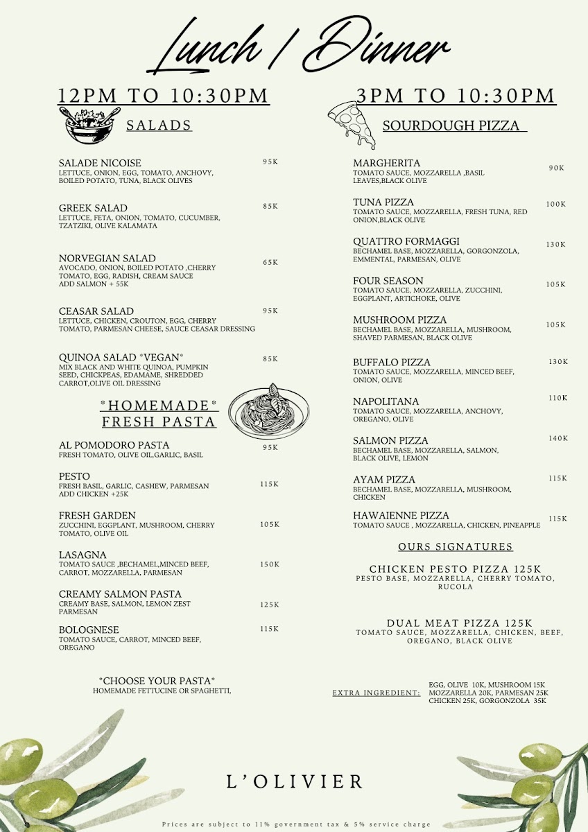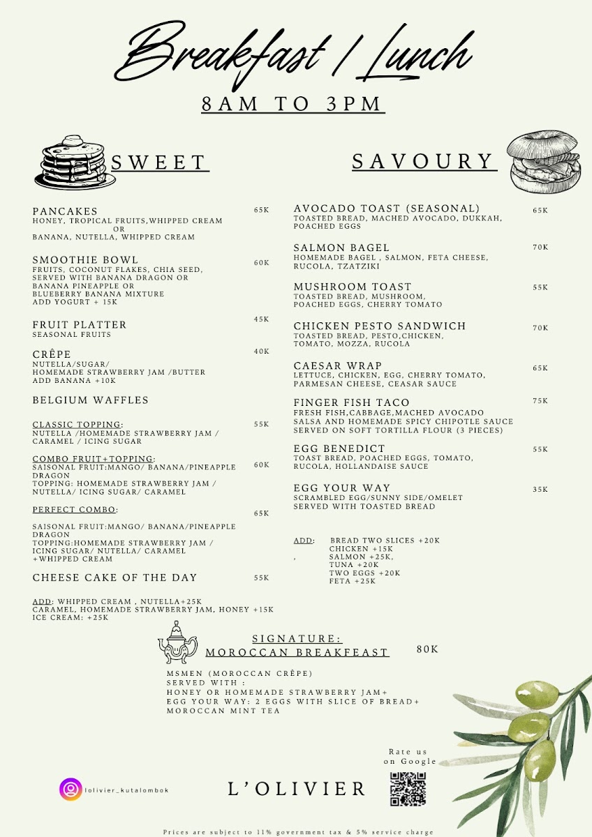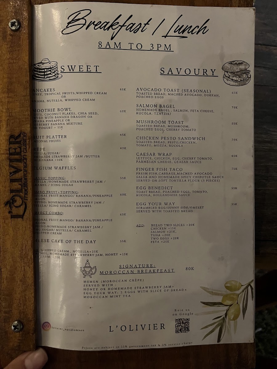 Welcome to L'Olivier restaurant, a hidden gem located in the heart of Kuta, Lombok. This culinary haven offers a varied menu that transports you beyond traditional Indonesian flavors. Patrons rave about their dishes, with standout items like fresh pizzas, delicious wraps, and delightful avocado toasts. The homemade pasta and generous burgers also draw praise, showcasing the kitchen's commitment to quality. Guests like Lusi Folk and Samra B found joy in the vibrant food options that cater to diverse palates, despite the recognition that it's not a typical local dining experience.